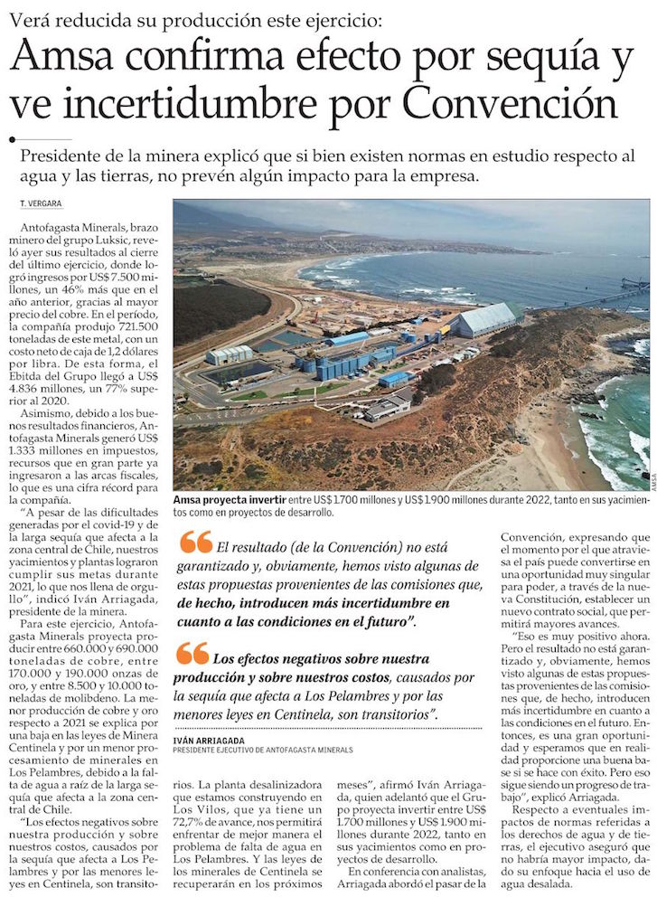 Antofagasta Minerals y la Convención: “Puede convertirse en una oportunidad muy singular para poder establecer un pacto social” - (Diario Financiero)