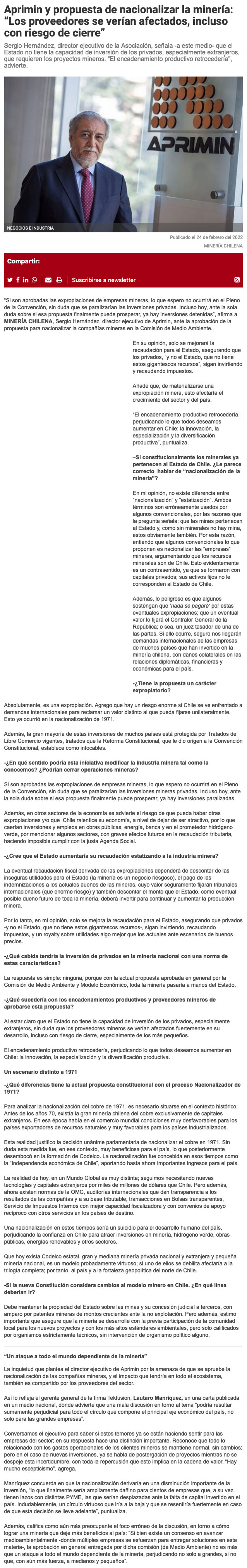 Aprimin y propuesta de nacionalizar la minería: “Los proveedores se verían afectados, incluso con riesgo de cierre” - (Maray Online)