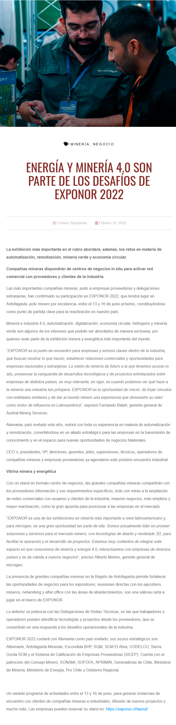 Energía y Minería 4.0 son parte de los desafíos de Exponor 2022 - (norteyenergia.cl)