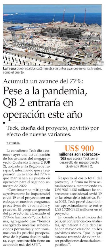 Teck advierte impactos adicionales por ómicron en Chile y define el próximo paso tras Quebrada Blanca II - (Diario Financiero)