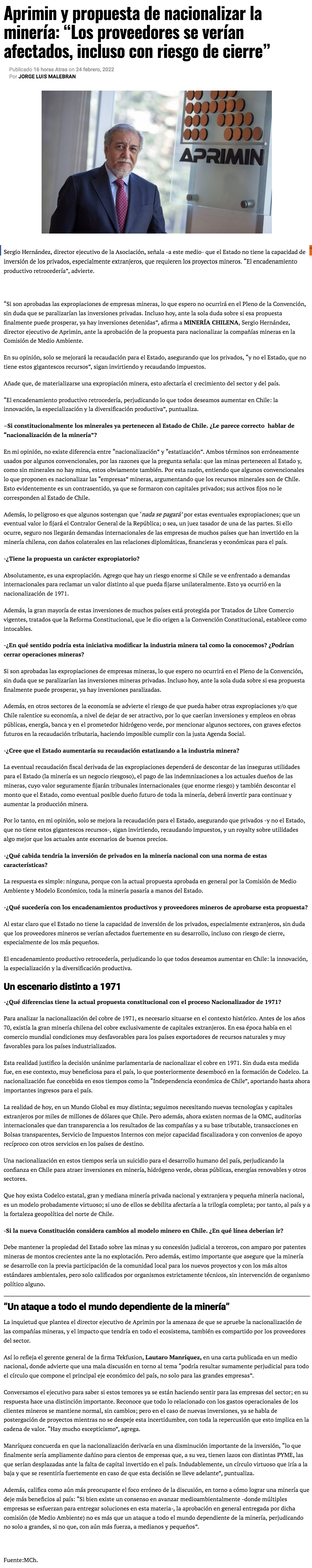 Aprimin y propuesta de nacionalizar la minería: “Los proveedores se verían afectados, incluso con riesgo de cierre” - (mch.cl)