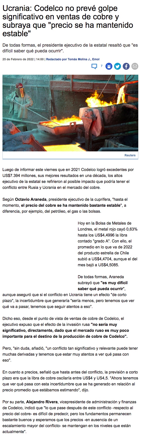 Codelco y efecto de invasión a Ucrania en el cobre: "Tenemos que estar muy atentos a ver qué pasa" - (DF Online)