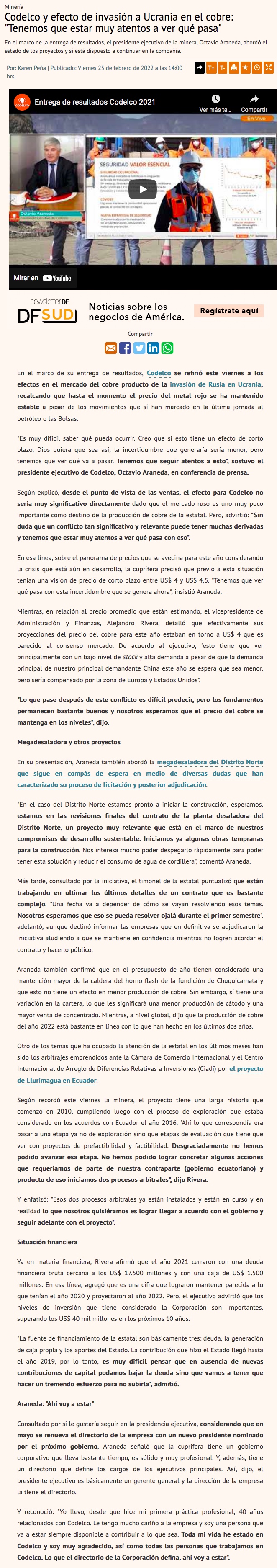 Ucrania: Codelco no prevé golpe significativo en ventas de cobre y subraya que "precio se ha mantenido estable" - (emol)