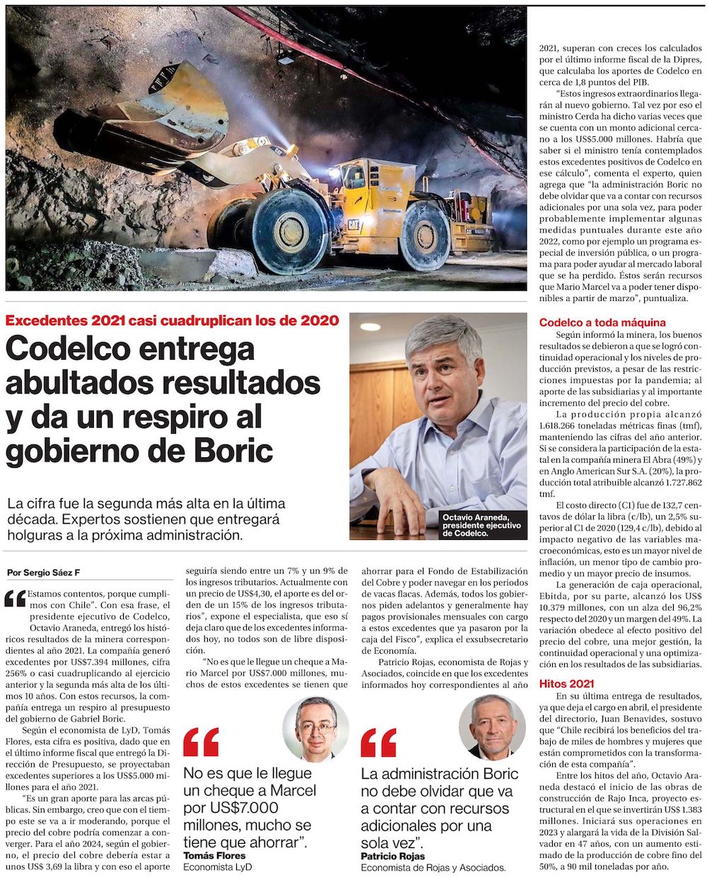Codelco tuvo en 2021 su mejor resultado en una década por precio histórico del cobre - (Pulso)