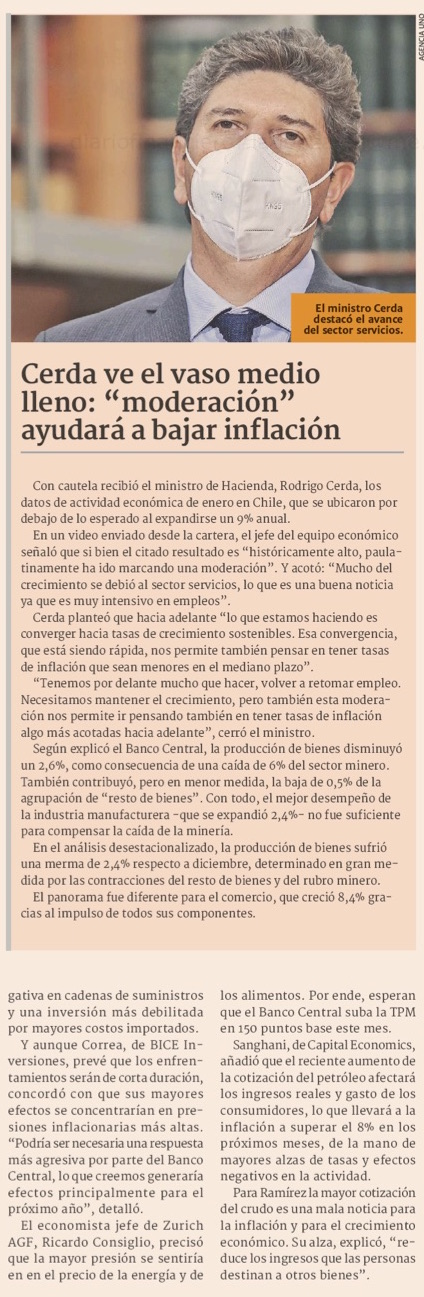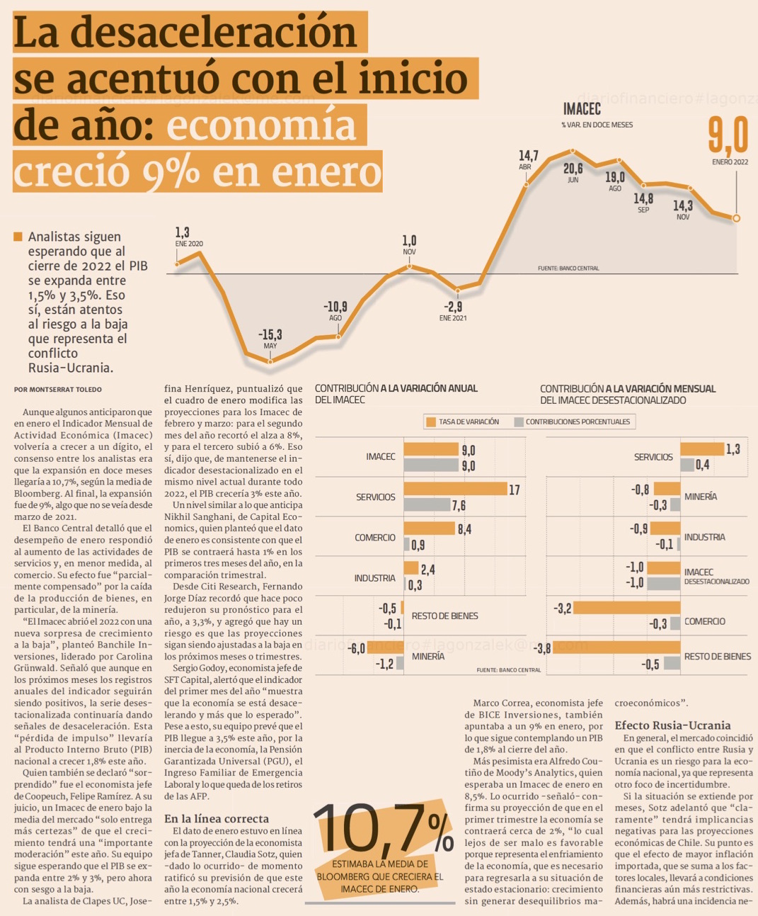 Economía chilena parte 2022 con desempeño más débil del previsto y se contrae respecto de diciembre - (El Mercurio de Santiago)