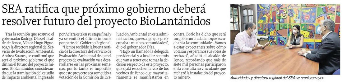 Gobierno entrante decidirá sobre proyecto de tierras raras en Penco - (Diario Concepción)