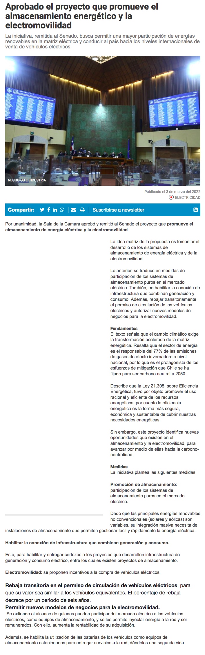 Avanza al Senado proyecto que promueve el almacenamiento energético y la electromovilidad - (electromov.cl)
