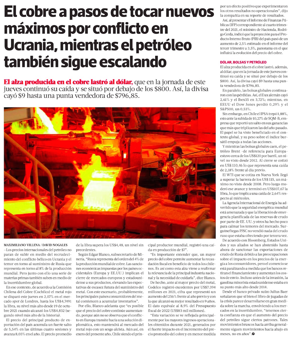 La libra de cobre escaló hasta los US$4,749 por efecto de invasión rusa - (El Mercurio de Antofagasta)