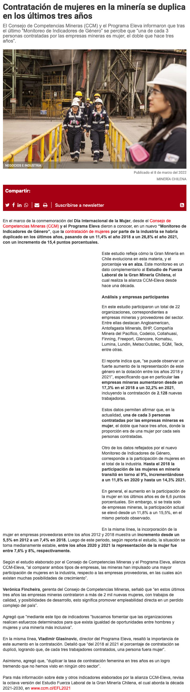 Contratación de mujeres en minería se duplicó en los últimos tres años - (nuevaminería online)