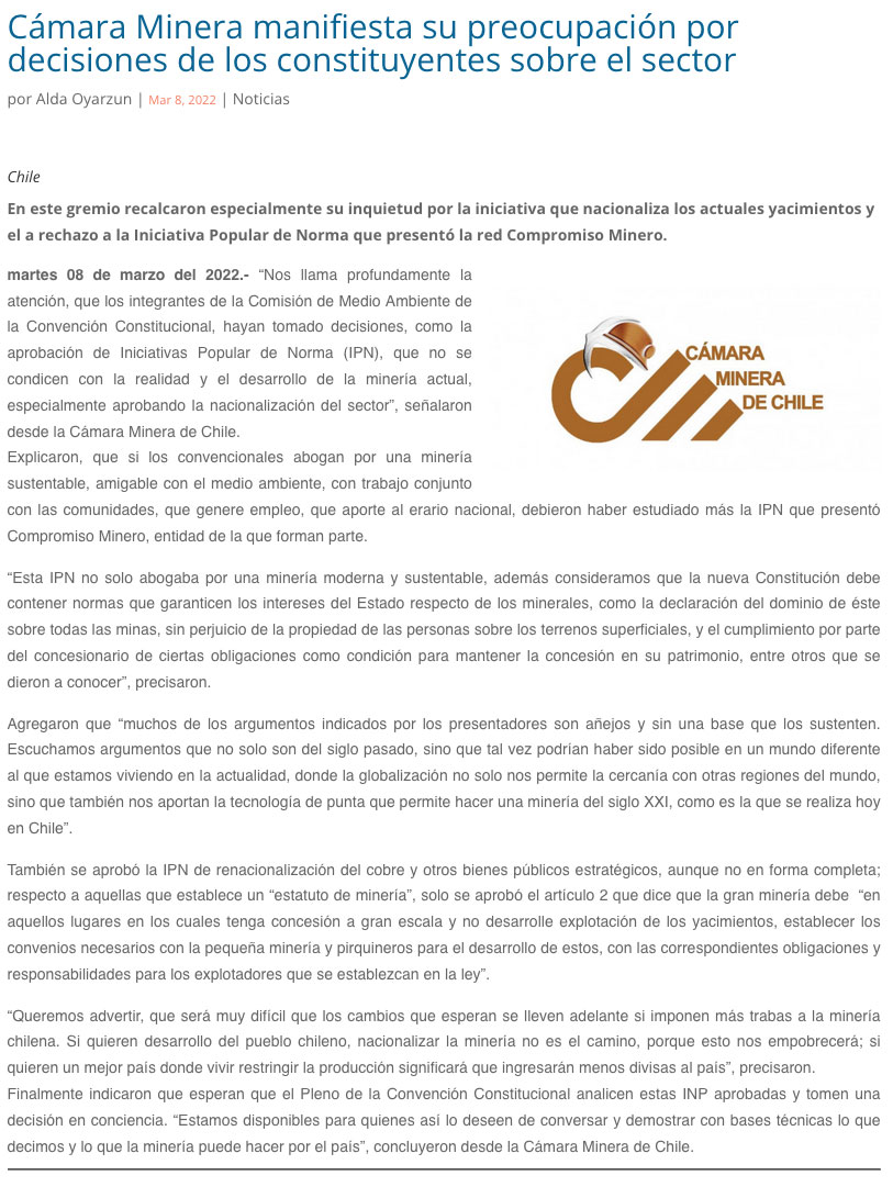 Cámara Minera de Chile manifiesta su preocupación por decisiones de los Constituyentes ante el sector minero - (elamerica)