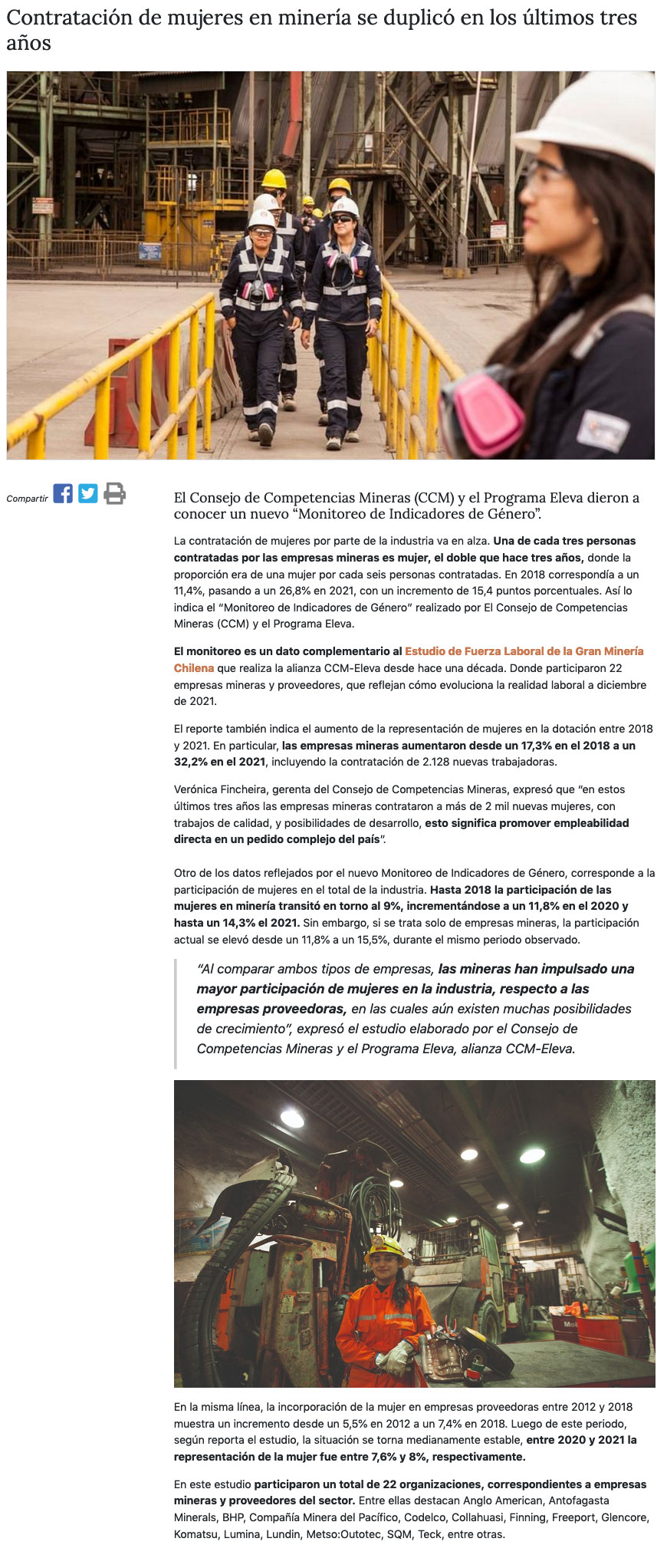 Contratación de mujeres en la minería se duplica en los últimos tres años - (mch.cl)