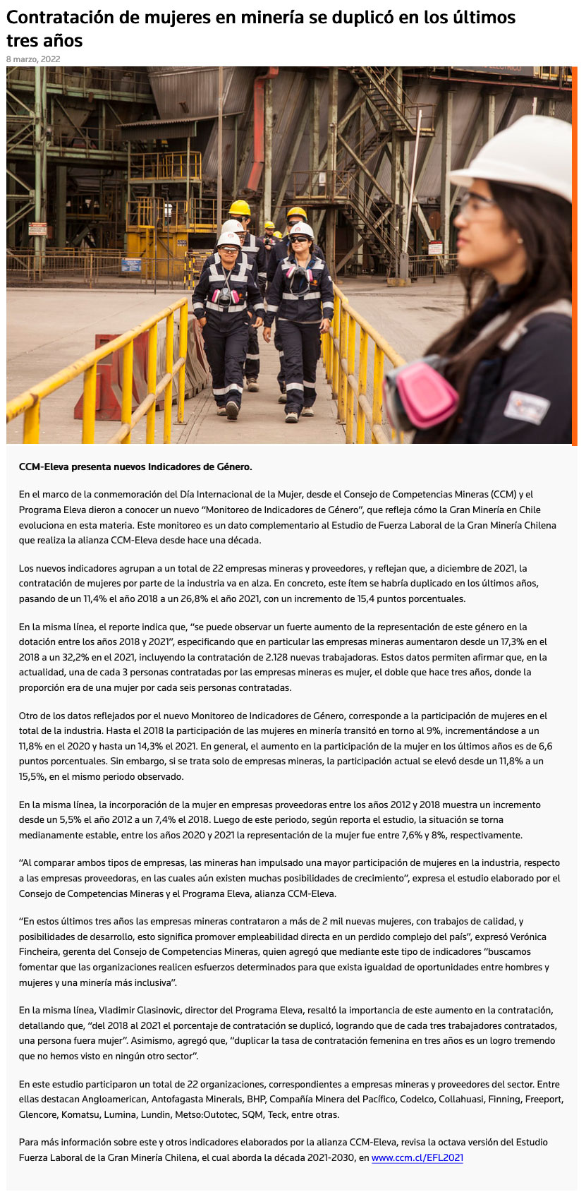 Contratación de mujeres en la minería se duplica en los últimos tres años - (mch.cl)