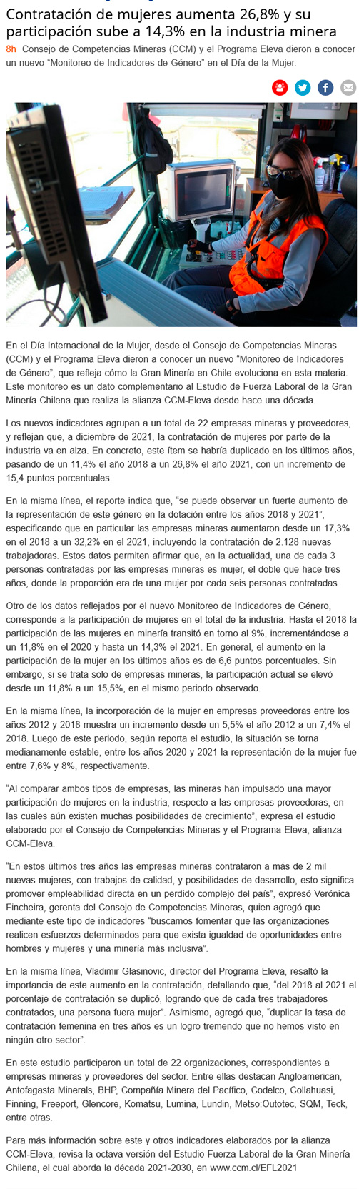 Contratación de mujeres se duplicó en los últimos tres años en el sector minero - (El Mercurio de Antofagasta)