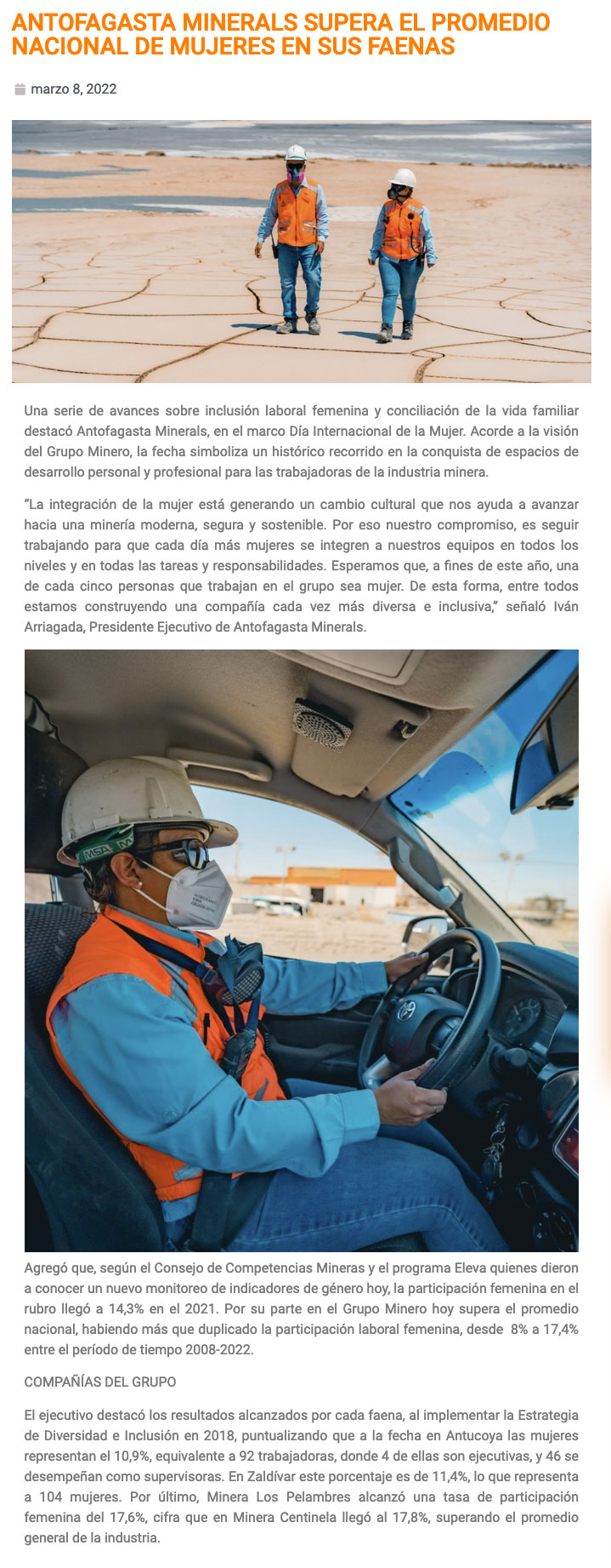 En Antofagasta Minerals 1 de cada 5 personas será mujer este 2022 - (timeline)