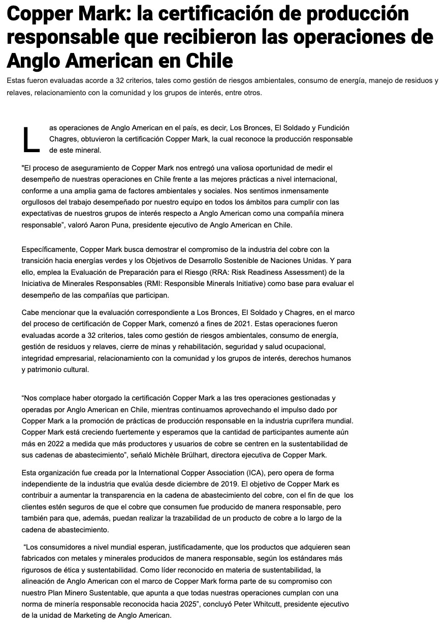 Operaciones de compañía minera chilena obtiene certificación por producción responsable - (americaeconomia online)