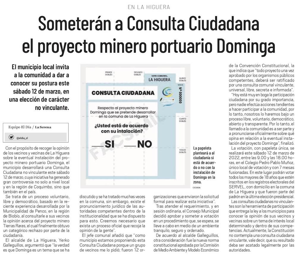 Municipio de La Higuera realiza una consulta ciudadana que defina apoyo o rechazo de DOMINGA - (La Región)