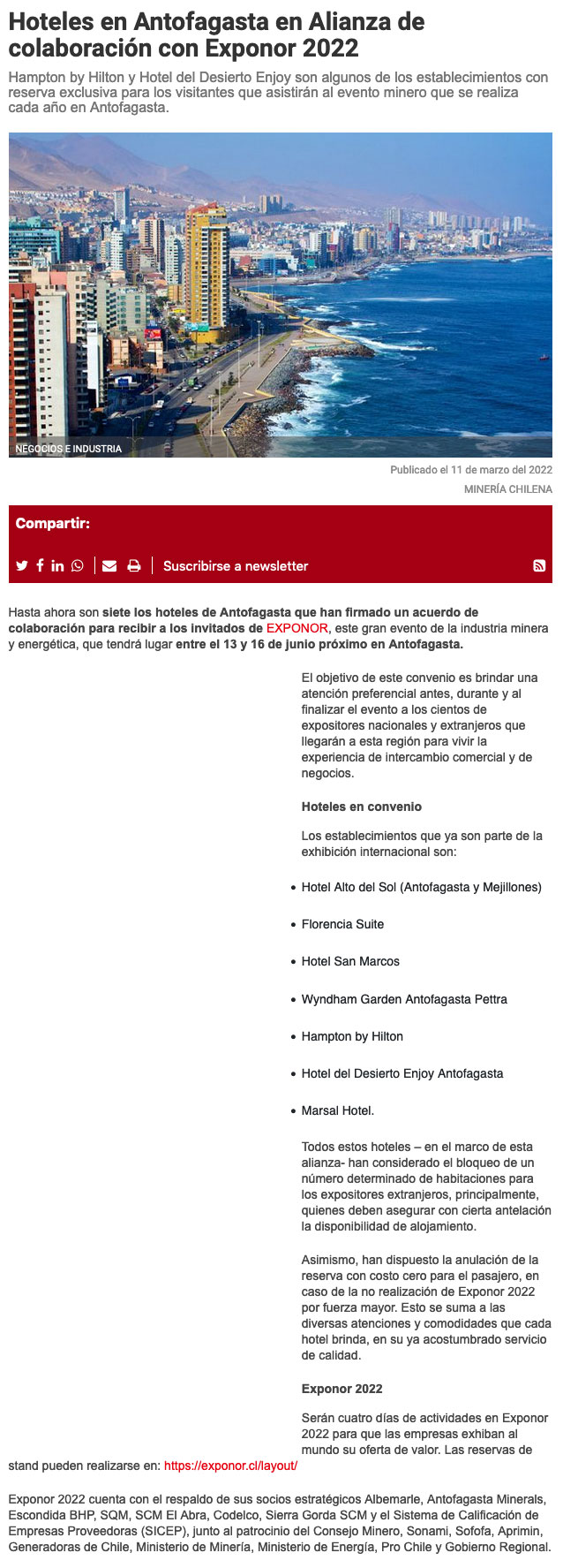 Hoteles de Antofagasta sellan alianza de colaboración con Exponor 2022 - (El Mercurio de Antofagasta)