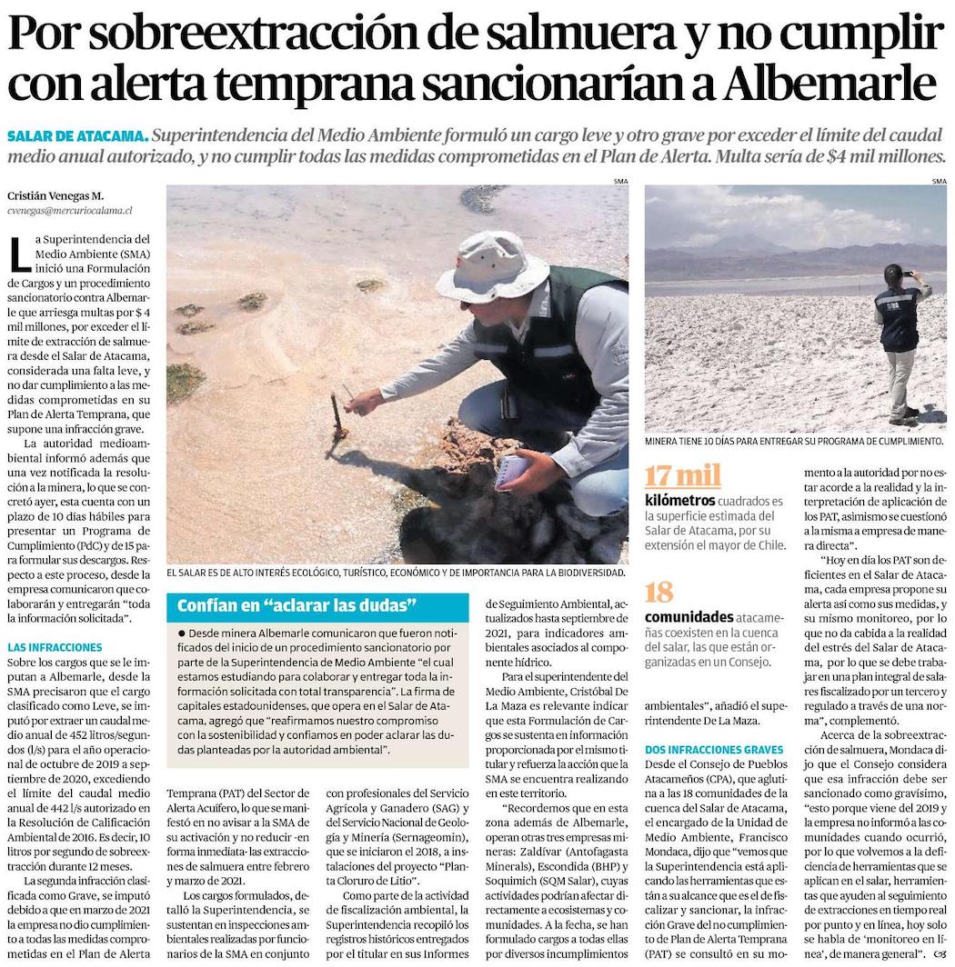 Levantan cargos contra Albemarle y multas podrían llegar a $ 4 mil mills - (El Mercurio de Santiago)