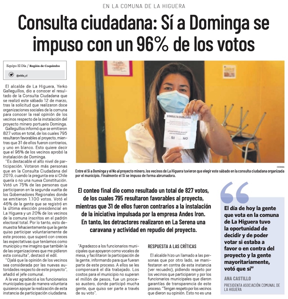 La Higuera: Instalación del proyecto alcanzó 96,1% de apoyo en consulta ciudadana - (El Mercurio de Santiago)