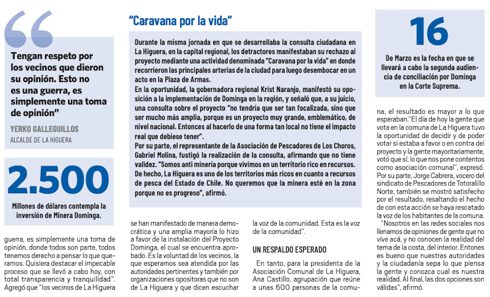 La Higuera: Instalación del proyecto alcanzó 96,1% de apoyo en consulta ciudadana - (El Mercurio de Santiago)