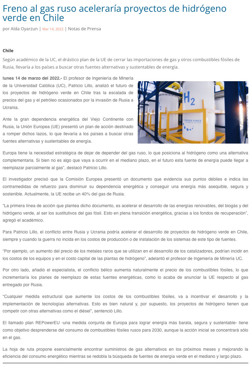 Investigador asegura que freno al gas ruso acelerará los proyectos de hidrógeno verde en Chile - (Medios Regionales Cadena El Mercurio)