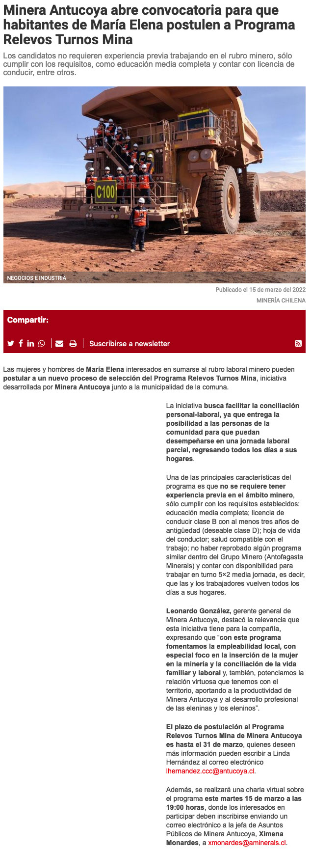 Antucoya inicia postulación a Programa Relevos Turnos Mina 2022 para habitantes de María Elena - (soyantofagasta)