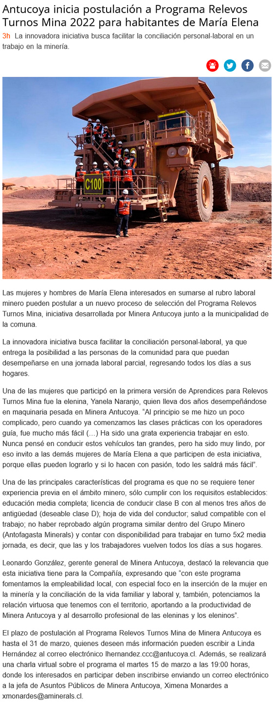 Minera Antucoya abre convocatoria para que habitantes de María Elena postulen a Programa Relevos Turnos Mina - (mch.cl)