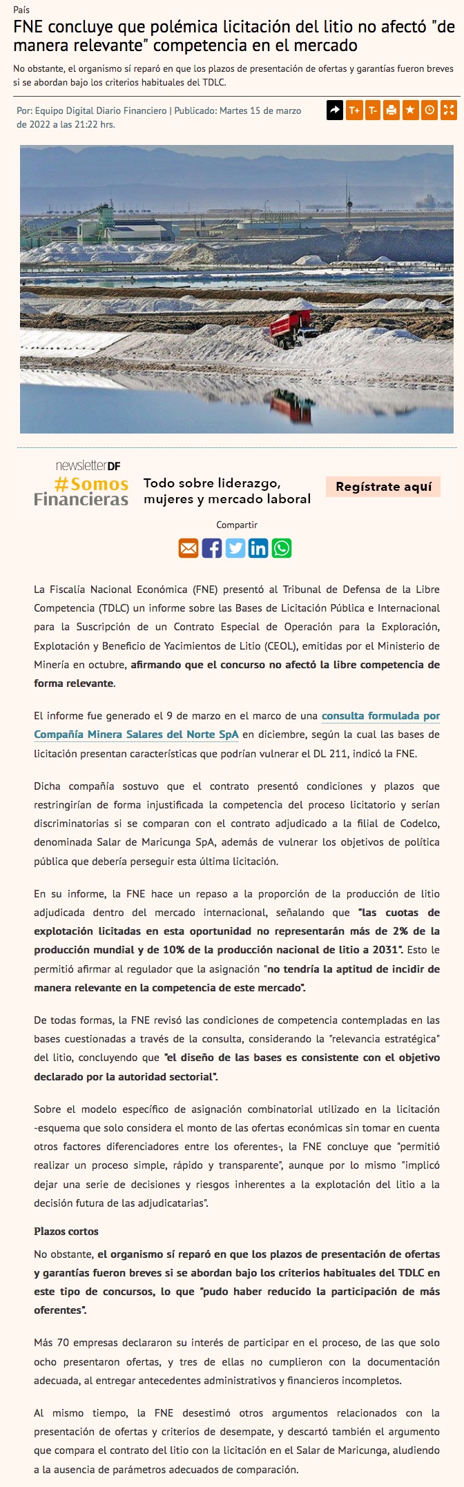 FNE descarta efectos en competencia por licitación del litio - (El Mercurio de Santiago)