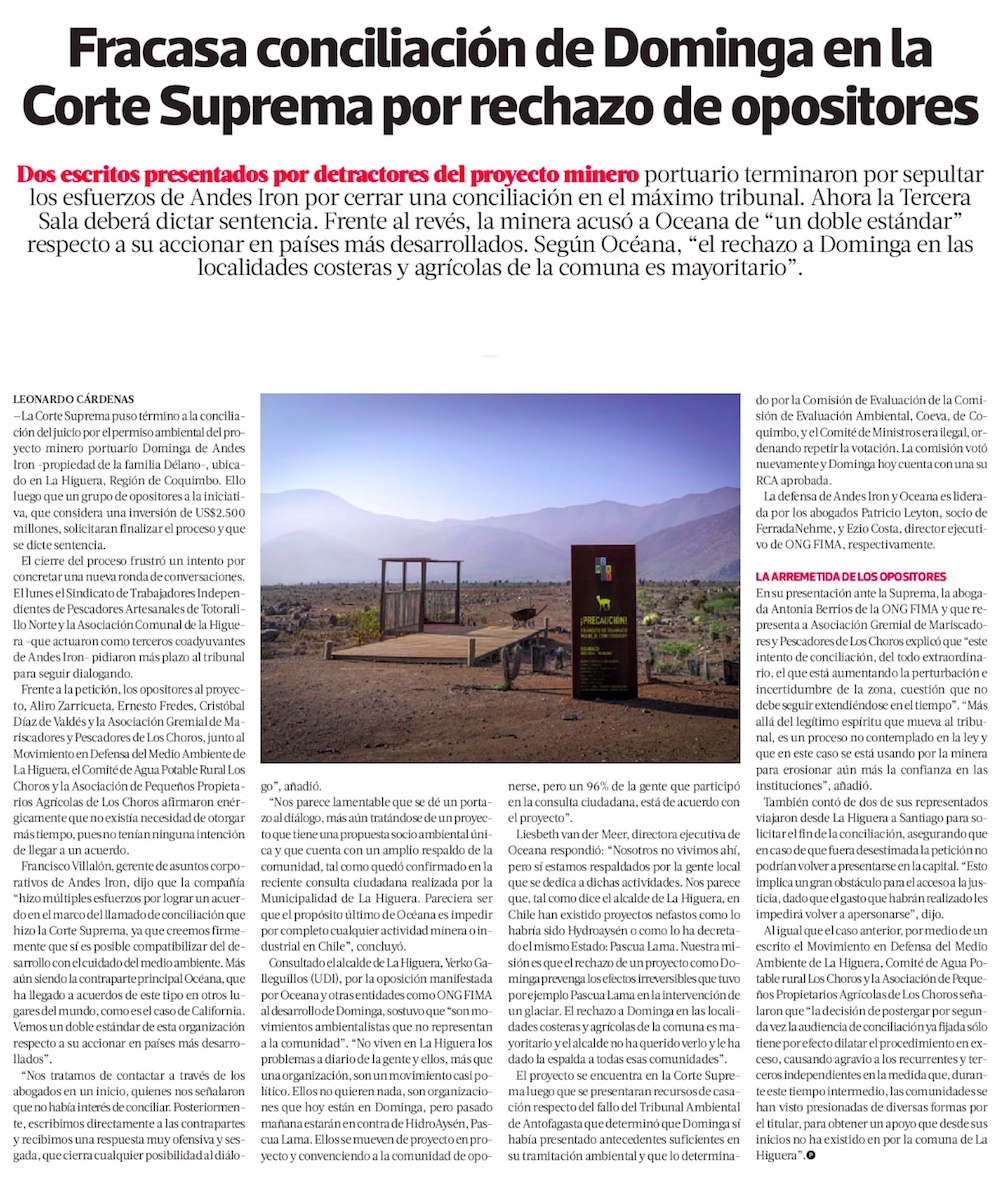 Descartan conciliación por Dominga en la Corte Sprema - (El Mercurio de Santiago)