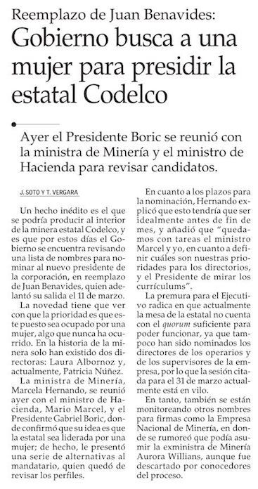 Presidente Boric recibe propuesta de candidatas mujeres para el directorio de Codelco - (Diario Financiero)