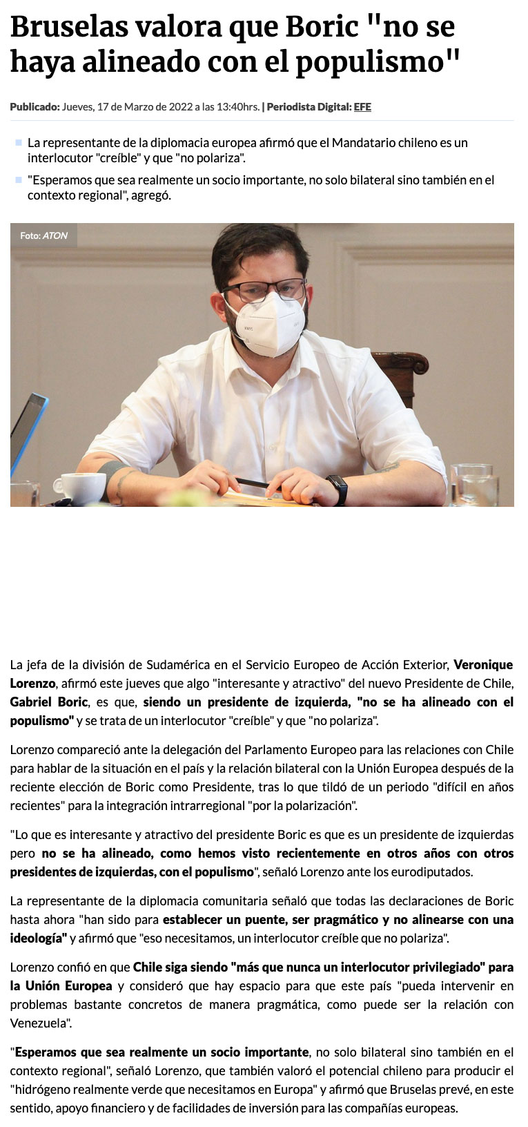 Diplomática de la Unión Europea destaca que Presidente Boric "no se ha alineado con el populismo" - (El Mostrador)