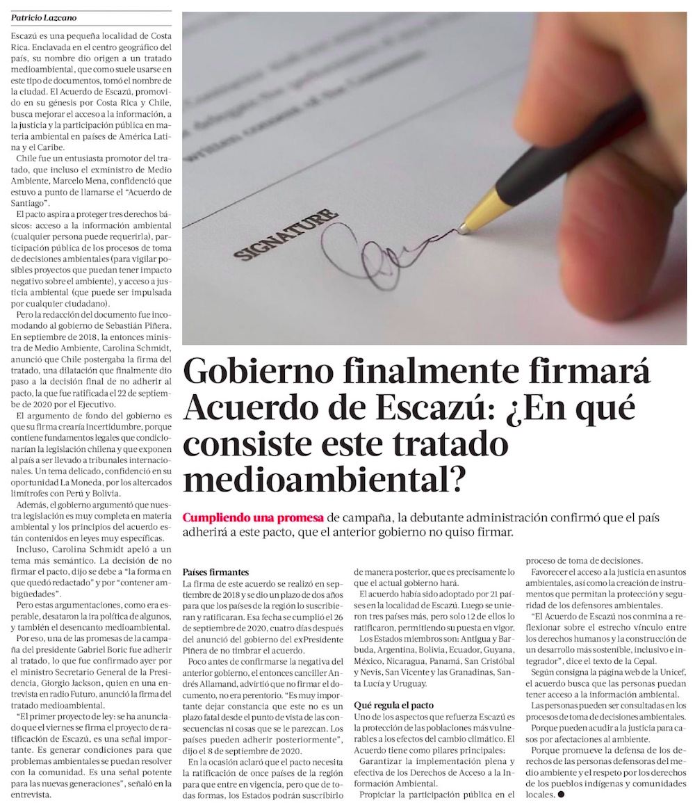 “Escazú pone a Chile en una mejor posición para recibir financiamiento internacional” - (Diario Financiero)
