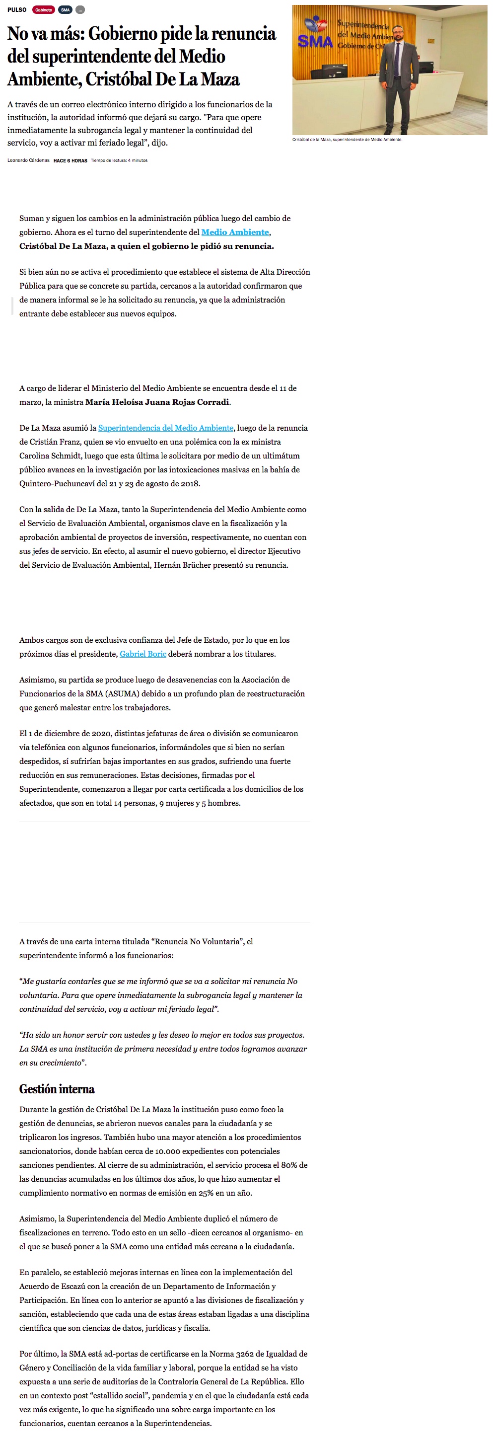 Superintendente del Medio Ambiente: “Se va a solicitar mi renuncia no voluntaria” - (Pulso)
