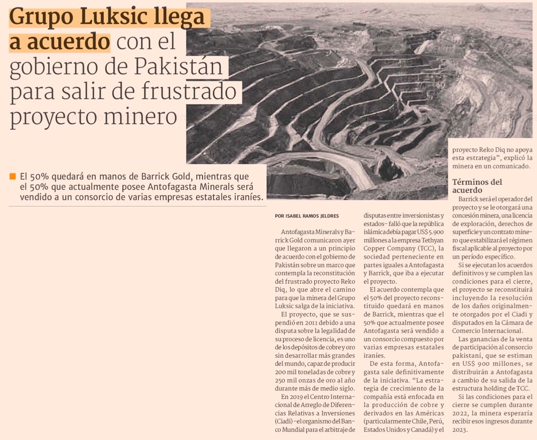 Minera de los Luksic recibirá US$ 900 millones por fallido proyecto en Pakistán - (El Mercurio de Santiago)