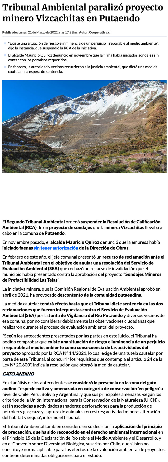 Segundo Tribunal Ambiental ordenó la suspensión de la RCA del proyecto de sondajes de minera Vizcachitas en Putaendo - (El Mostrador)