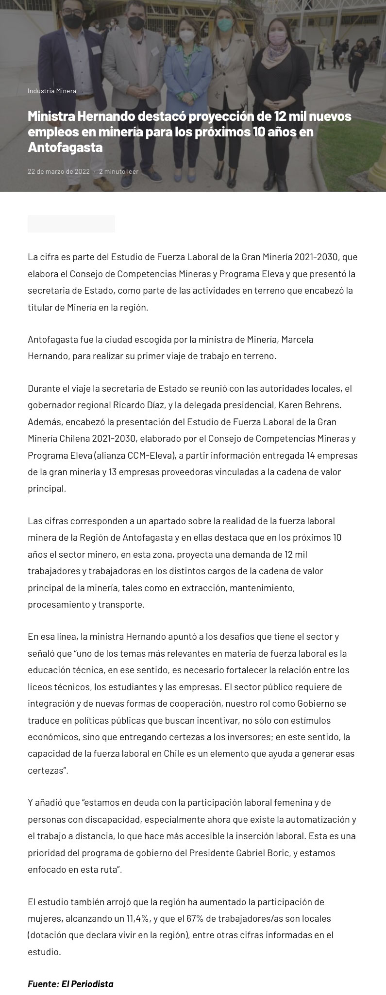 Ministra Hernando destacó proyección de 12 mil nuevos empleos en minería para los próximos 10 años en Antofagasta - (nuevaminería online)