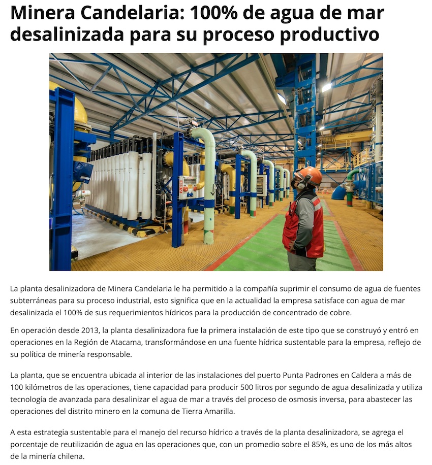 Minera Candelaria recurre al agua de mar desalinizada para satisfacer requerimientos de su proceso productivo - (mch.cl)