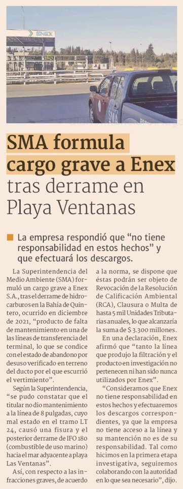 SMA formula cargo grave a Enex S.A. por vertimiento - (El Mercurio de Valparaíso)