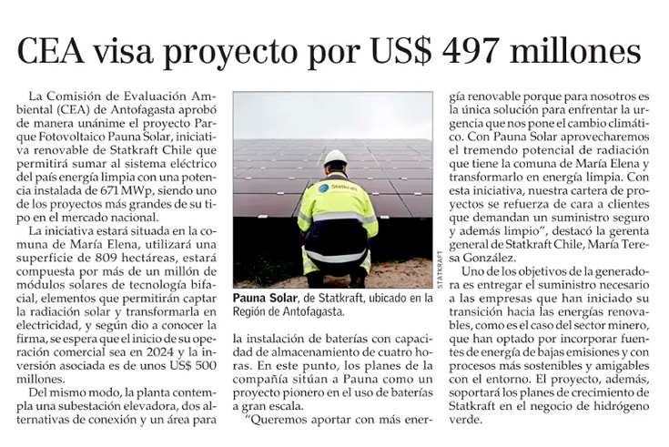 Proyecto solar Pauna que requerirá inversión de US$ 496 millones es autorizado por el CEA - (El Mercurio de Antofagasta)