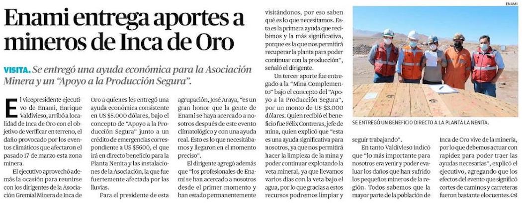 Enami entrega aportes a mineros de Inca de Oro - (tierramarillano.cl)