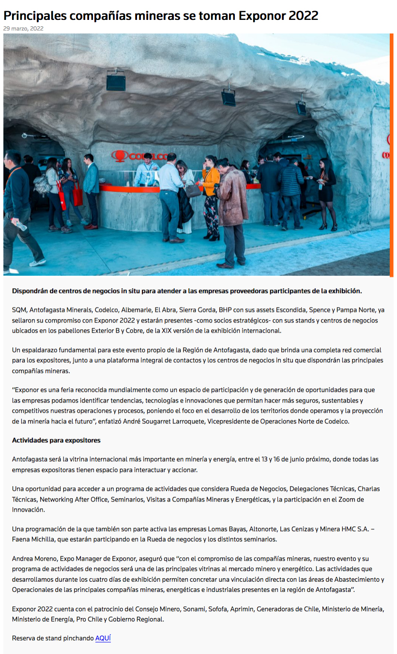 Exponor 2022: Principales compañías mineras confirman participación - (mch.cl)