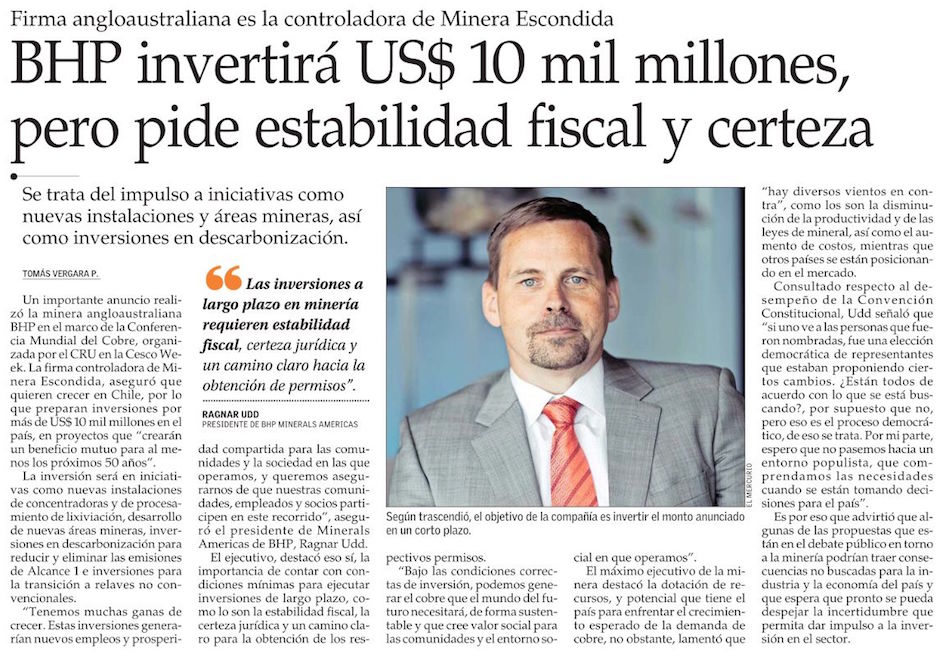 BHP dice estar dispuesta a invertir US$ 10 mil millones en Chile en “condiciones apropiadas” - (Diario Financiero)
