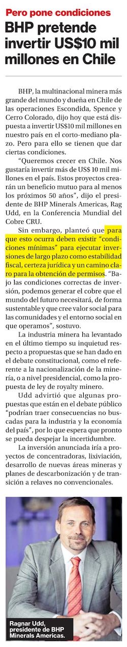 BHP invertirá US$ 10 mil millones, pero pide estabilidad fiscal y certeza - (El Mercurio de Santiago)