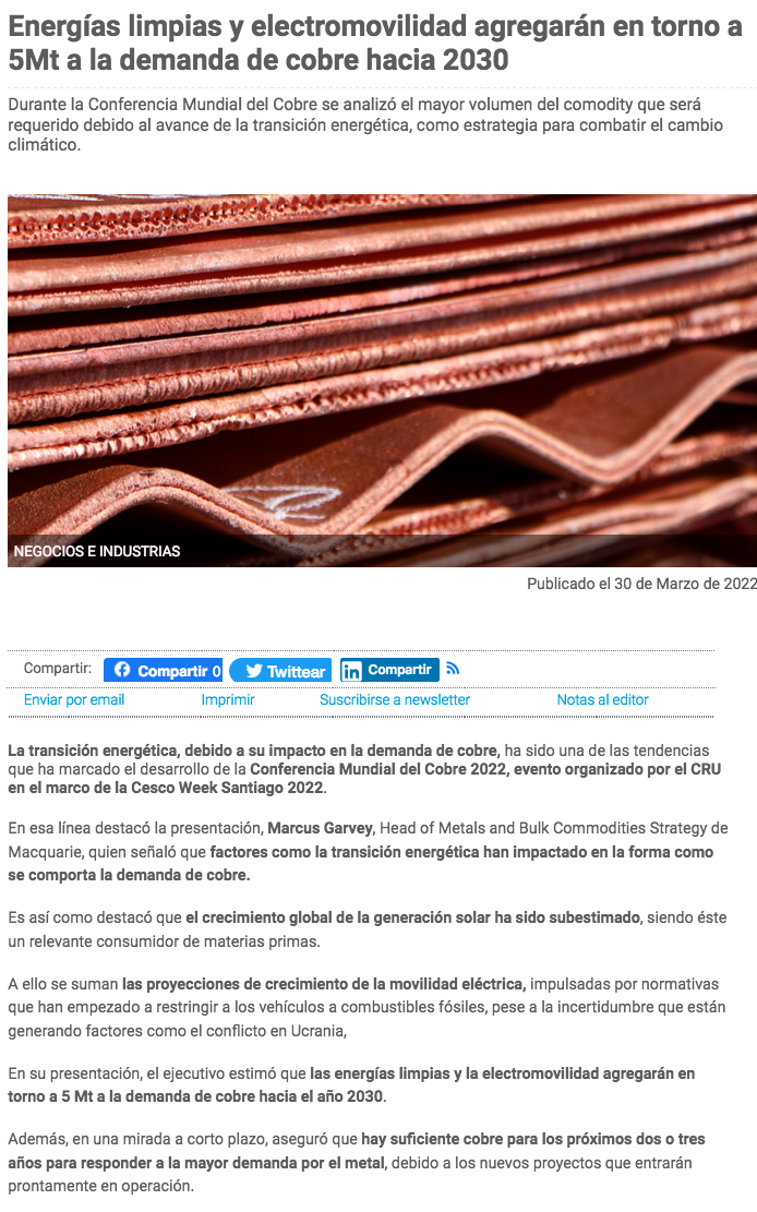 Energías limpias y electromovilidad agregarán en torno a 5Mt a la demanda de cobre hacia 2030 - (mch.cl)