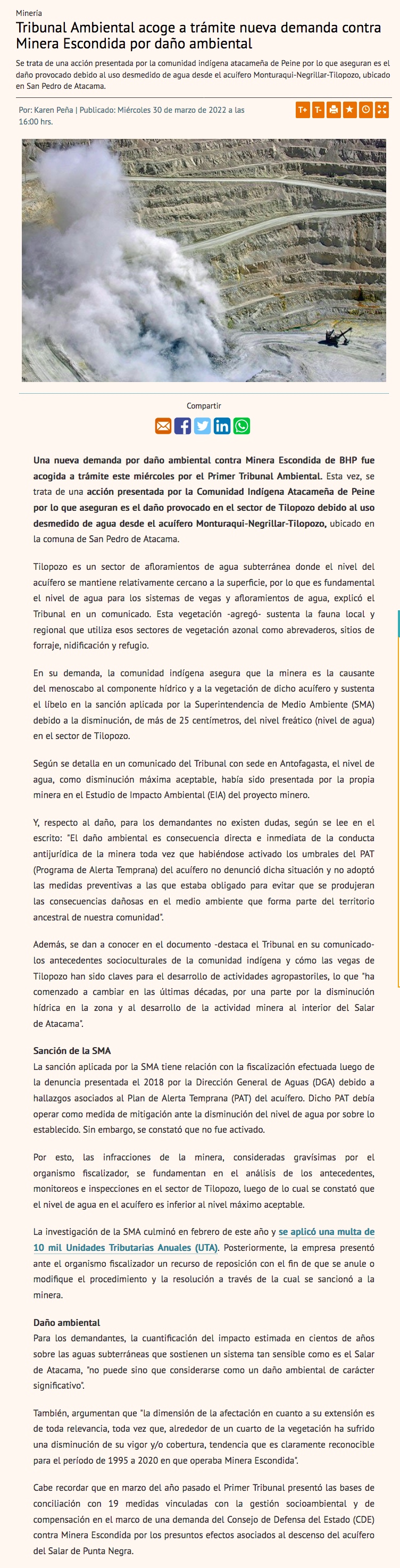 Tribunal admite a tramitación demanda de Peine contra Escondida por daño ambiental - (El Mercurio de Antofagasta)