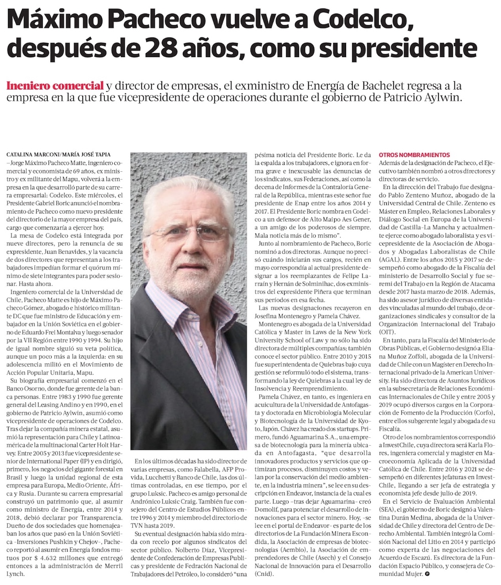 Gabriel Boric nomina a Máximo Pacheco como nuevo presidente del directorio de la minera estatal Codelco - (El Mercurio de Santiago)