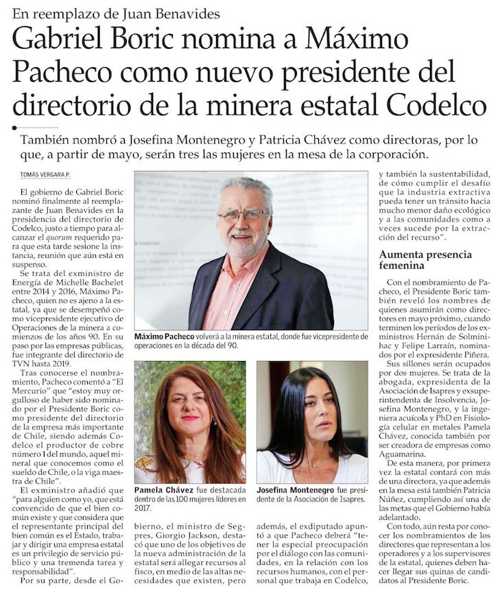Boric nombra a Máximo Pacheco como presidente de Codelco - (Diario Financiero)