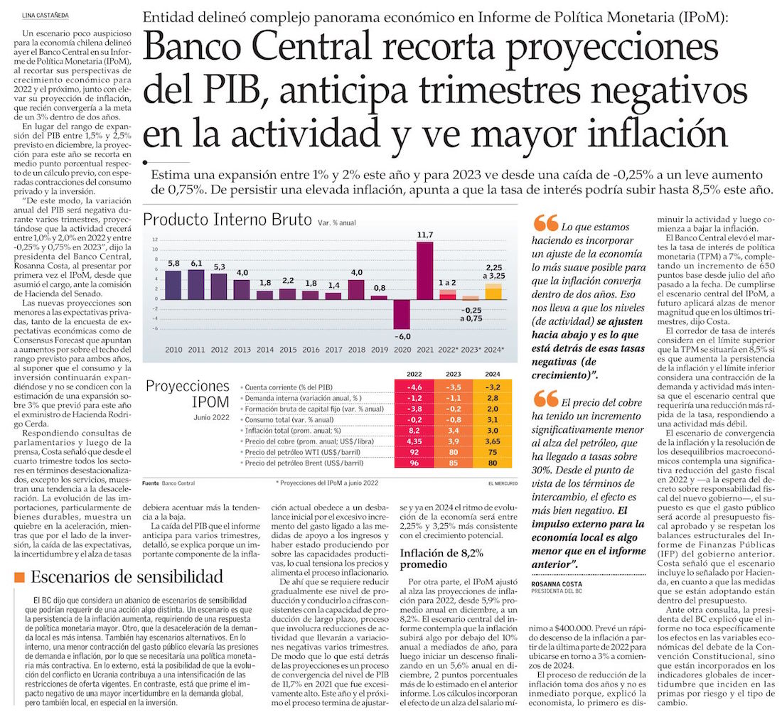 Banco Central ajusta a la baja crecimiento de este año, abre la puerta a una contracción en 2023 y fija nuevo techo para la tasa en 8,5% - (Pulso)