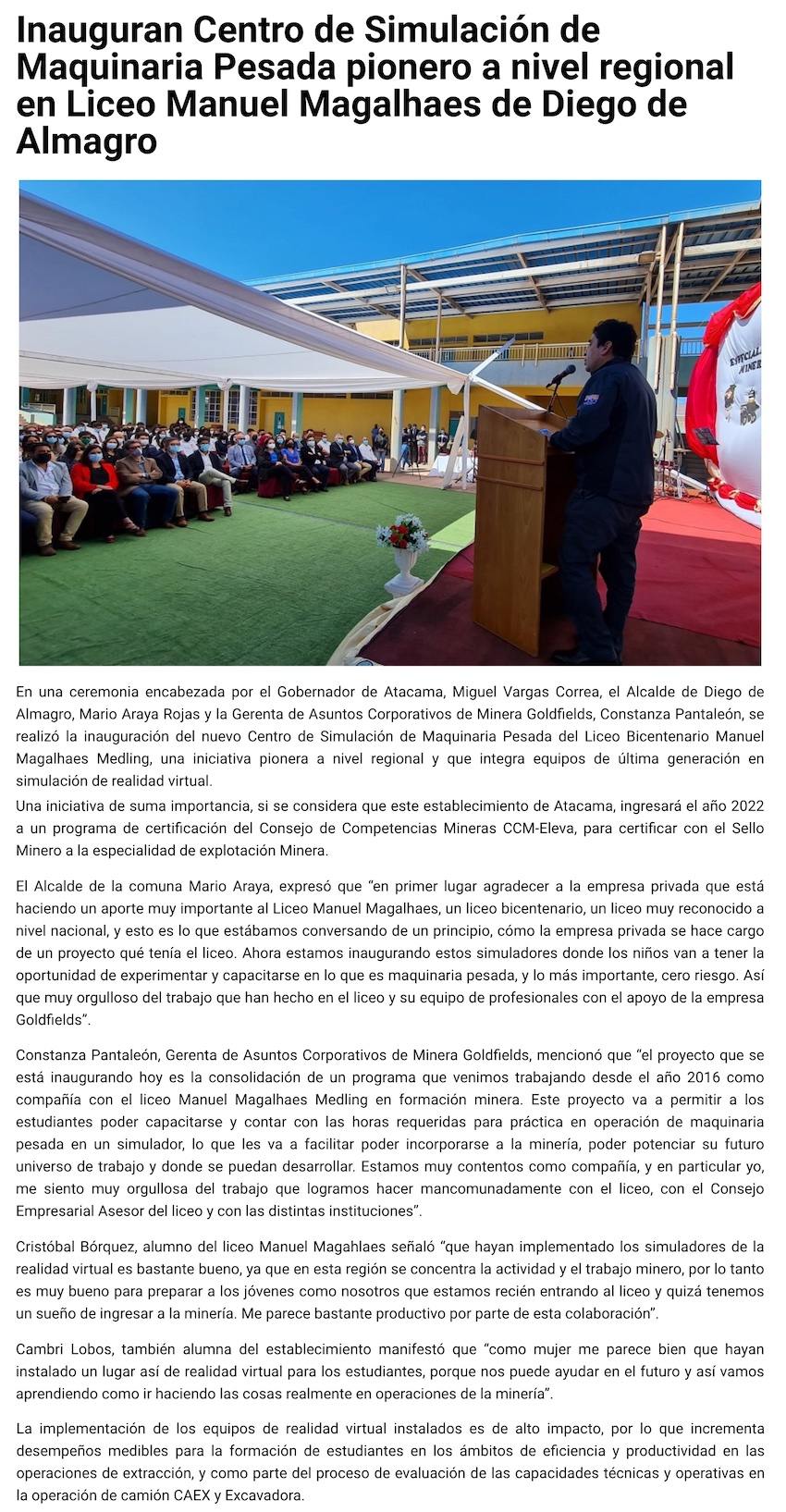 Inauguran Centro de Simulación de Maquinaria Pesada pionero a nivel regional en Liceo Manuel de Magalhaes de Diego de Almagro - (tierramarillano.cl)