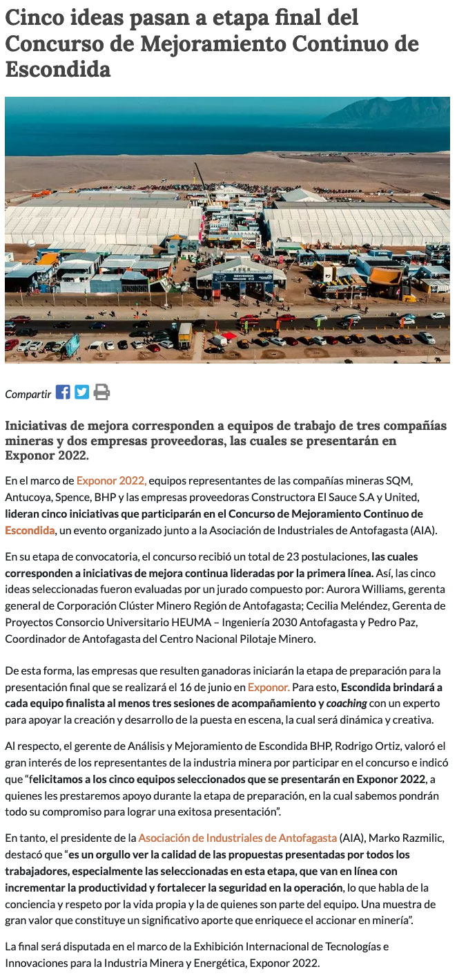 Cinco ideas pasan a etapa final del Concurso de Mejoramiento Continuo de Escondida | BHP - (timeline)